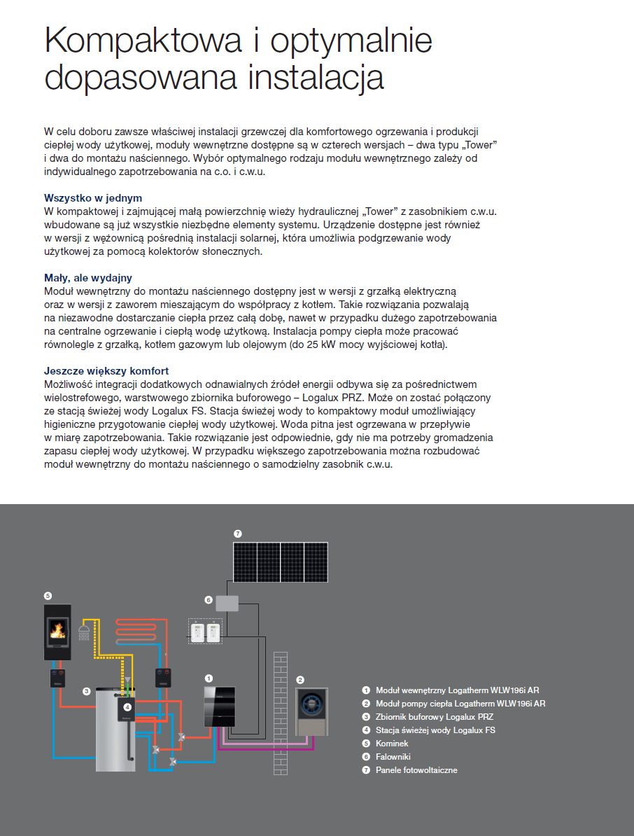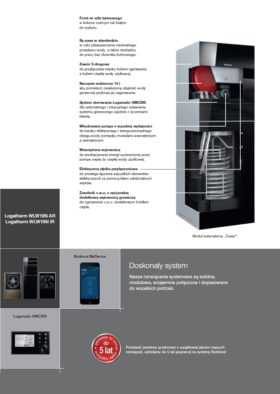 Logatherm WLW196i AR T190 to najwyższej klasy pompa ciepła powietrze-woda o niezwykle nowoczesnym wyglądzie. Oferowana pompa ciepła składa się z modułu zewnętrznego oraz modułu wewnętrznego. Dostęp do obu elementów jest niezwykle łatwy, a ich instalacja szybka. Moduły zewnętrzny i wewnętrzny połączone są za pomocą przewodów instalacji wodnej.